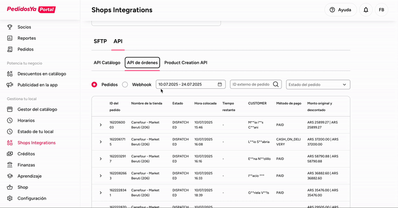 You can monitor the integrations from Partner Portal directly. When OT API triggers orders to your webhook success or failures are logged in the Shop Integrations > Order status updates tab. In the event of an observed error, it should be resolved by the Partner.