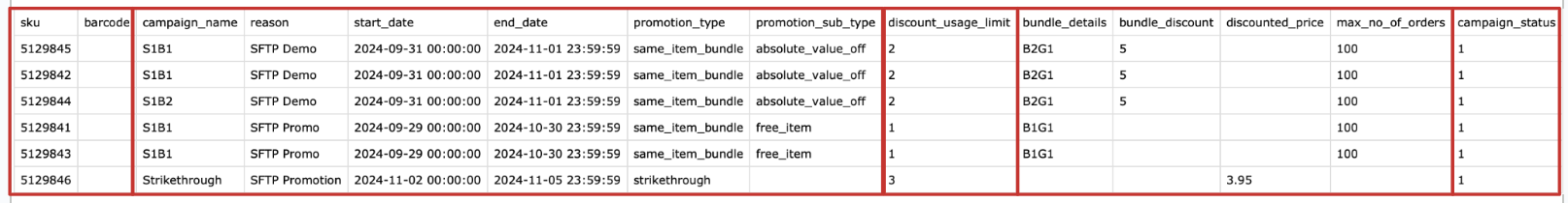 YYYY-MM-DDe.g 2025-06-15campaign_status- boolean, optional- either 1 for active or 0 for inactive. If you are not sending the campaign status, system will assume it is ‘1’ (to enable to promotion)promotion_type-enum, requiredsame_item_bundlestrikethrough