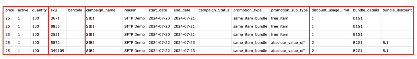Here is the example on how the Single Promotion File might look - In this example there are also Catalog updates included. Catalog part is discussed in more detail in the SFTP: Catalog section.
